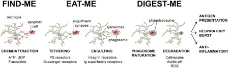 La microglía también se encarga de fagocitar los restos de neuronas que han muerto por apoptosis, un proceso normal que elimina el exceso de neuronas generadas como parte del desarrollo cerebral y también de la neurogénesis de los adultos. Pero la microglía no son solo basureros o carroñeros, también son exterminadores de neuronas y llevan a muchas a su muerte programada induciendo la apoptosis sin provocar una inflamación mediante la liberación de iones superóxido, factor de crecimiento nervioso y factor de necrosis tumoral. En condiciones fisiológicas, la fagocitosis por la microglía se acopla con la apoptosis a través de señales «encuéntrame». Una de las más potentes es el ATP que es liberado por las neuronas en apoptosis. En un cerebro sano la proporción de células microgliales fagocitando en un momento determinado es muy baja, lo que indica que hay un amplio potencial para reclutar más células en caso de necesidad. La microglía es también crucial para la regulación de la plasticidad sináptica dependiente de actividad, la neurogénesis adulta y el aprendizaje y la memoria.