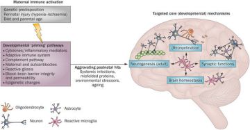 Si a hembras preñadas se les induce una actividad inmunitaria materna, mediante un componente bacteriano como el lipopolisacárido se genera un perfil de citocinas proinflamatorio en el cerebro fetal y ese perfil se mantiene hasta la primera madurez en la amígdala. La inflamación activa células en el cerebro fetal y produce alteraciones en dos poblaciones gliales: microglía y astrocitos. Más aún, las citocinas y sus efectos sobre la glía pueden tener consecuencias negativas para la viabilidad de las neuronas. Estos cambios inducidos por la respuesta inmunitaria y mediados por astrocitos y microglía pueden explicar una predisposición a algunos trastornos donde está implicada la amígdala, como la ansiedad y la depresión, y también a trastornos del neurodesarrollo, como el autismo.