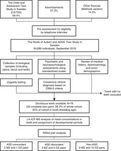 Los investigadores analizaron 6 parejas de gemelos (5 monozigóticas y 1 dizigótica) concordantes (los dos niños tenían TEA), 7 parejas de gemelos (3 monozigóticas y 4 dizigóticas) discordantes (un niño tenía TEA y el hermano, no) y 19 parejas de gemelos sin TEA (9 monozigóticos y 10 dizigóticos). De esta manera, compararon los patrones de depósito de metales en niños donde solo uno de los dos tenía autismo, en otros donde lo tenían los dos y en otros donde no lo tenía ninguno. En total estudiaron 32 parejas de gemelos y 12 individuos sueltos de parejas de gemelos pero donde no estaba disponible el diente del otro hermano. También analizaron la relación entre niveles de metales y gravedad del trastorno.